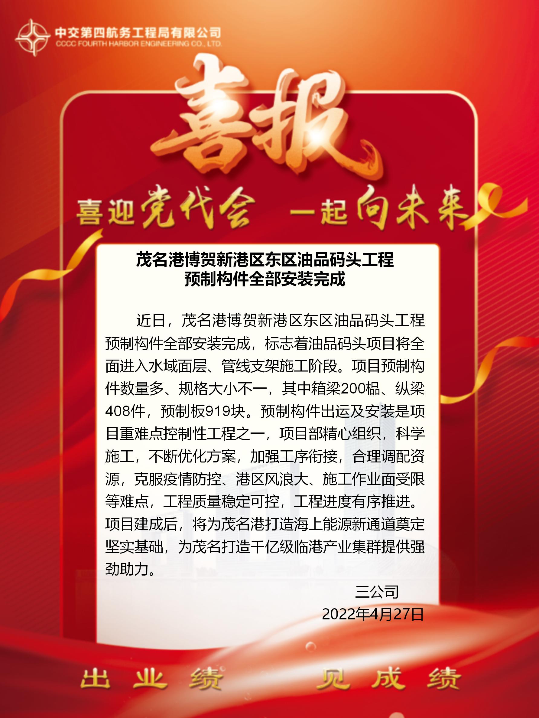 茂名港博賀新港區(qū)東區(qū)油品碼頭工程預(yù)制構(gòu)件全部安裝完成