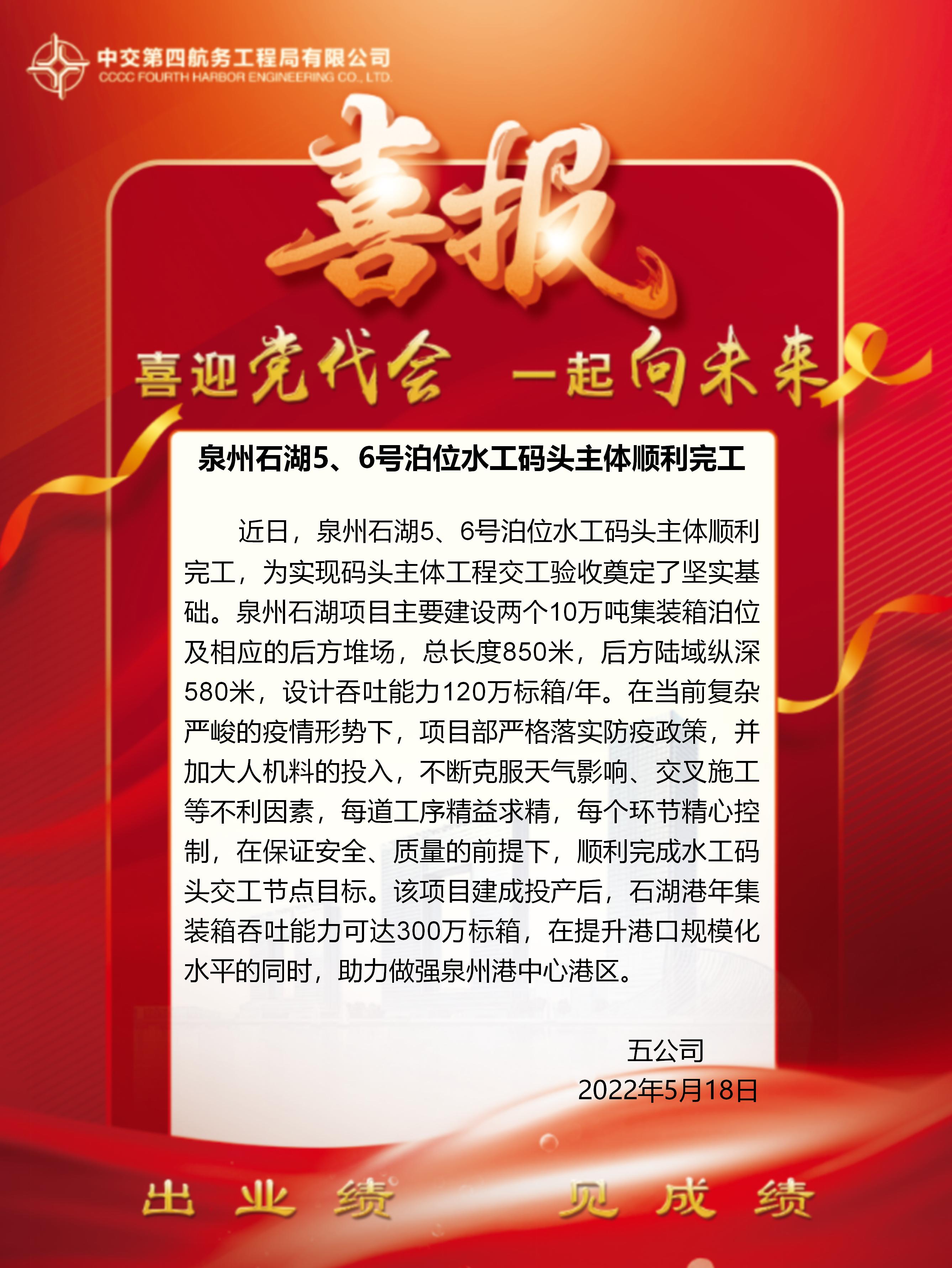 泉州石湖5、6號(hào)泊位水工碼頭主體順利完工