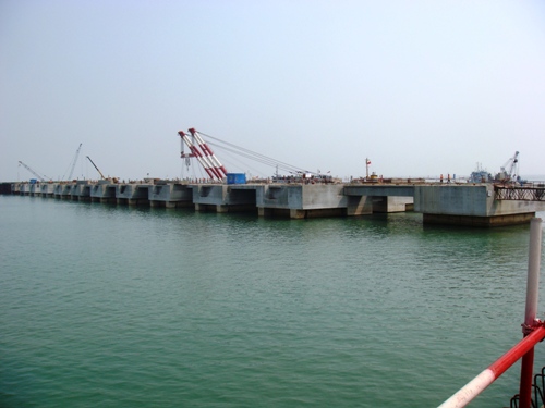 該項目自2007年6月份開工以來,三公司欽州港項目部不斷解放思想,實施技術(shù)創(chuàng)新,在施工中取得了重大突破。目前36萬立方米的基床拋石、整平以及40件沉箱的安裝已經(jīng)全部完成,胸墻澆注了30段,梁板安裝了300件,累計已完成產(chǎn)值達2.3億元,有望于今年6月份交付業(yè)主投入使用,比原計劃提前1個月完成。