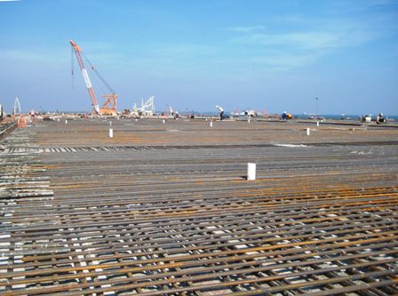 該工程為高樁梁板結(jié)構(gòu),碼頭長(zhǎng)度678米,碼頭沉樁基668根,預(yù)制安裝構(gòu)件1454件,現(xiàn)澆混凝土2.9萬(wàn)方,護(hù)岸拋石44萬(wàn)方,后方回填砂振沖密實(shí)78萬(wàn)方。橫梁部分采用C50高性能混凝土,共80條,單根混凝土方量118方。目前,現(xiàn)澆施工進(jìn)展順利,樁帽、橫梁已澆注完成,現(xiàn)澆面層及磨耗層施工將全面展開(kāi),項(xiàng)目部正搶趕進(jìn)度,爭(zhēng)取在12月底全面完成混凝土的澆筑任務(wù),完成年度施工計(jì)劃。