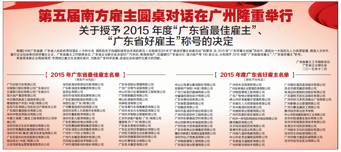12月8日,第五屆南方雇主圓桌對話會議暨“尋找廣東好雇主”頒獎儀式在廣州隆重舉行,四航局在這次評選活動中被授予“廣東省最佳雇主”稱號,并作了“構(gòu)建職業(yè)發(fā)展雙通道、營造員工幸福感”的主題發(fā)言。